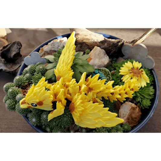 Sonnenblumen-Drache - gelb - 34 cm lang 10 cm hoch - viele bewegliche Teile - 3D-Druck - handbemalt