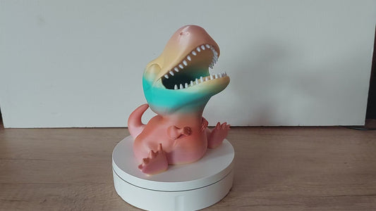 Süsser T-Rex Saurier als Spardose - 3D-Drucker - 16 cm lang - 17 cm hoch - rosa/grün/gelb/orange