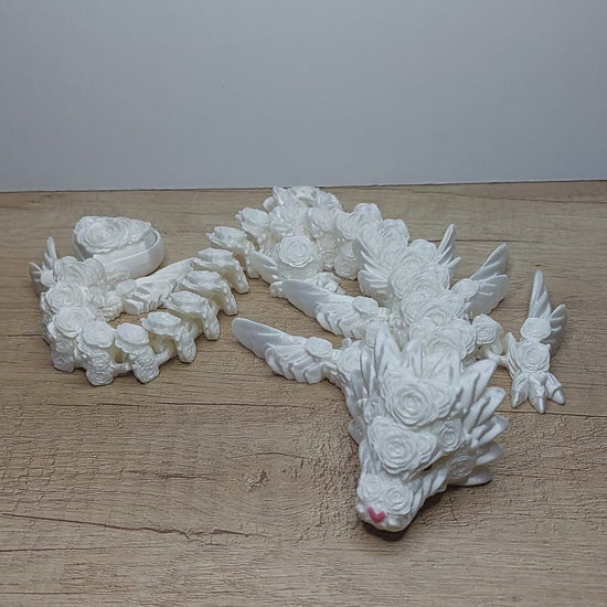 Herz-Rosen-Drache aus 3D-Druck | Voll beweglich mit Klicker | Romantische Drachenfigur | Weiß irisierend | 43 cm